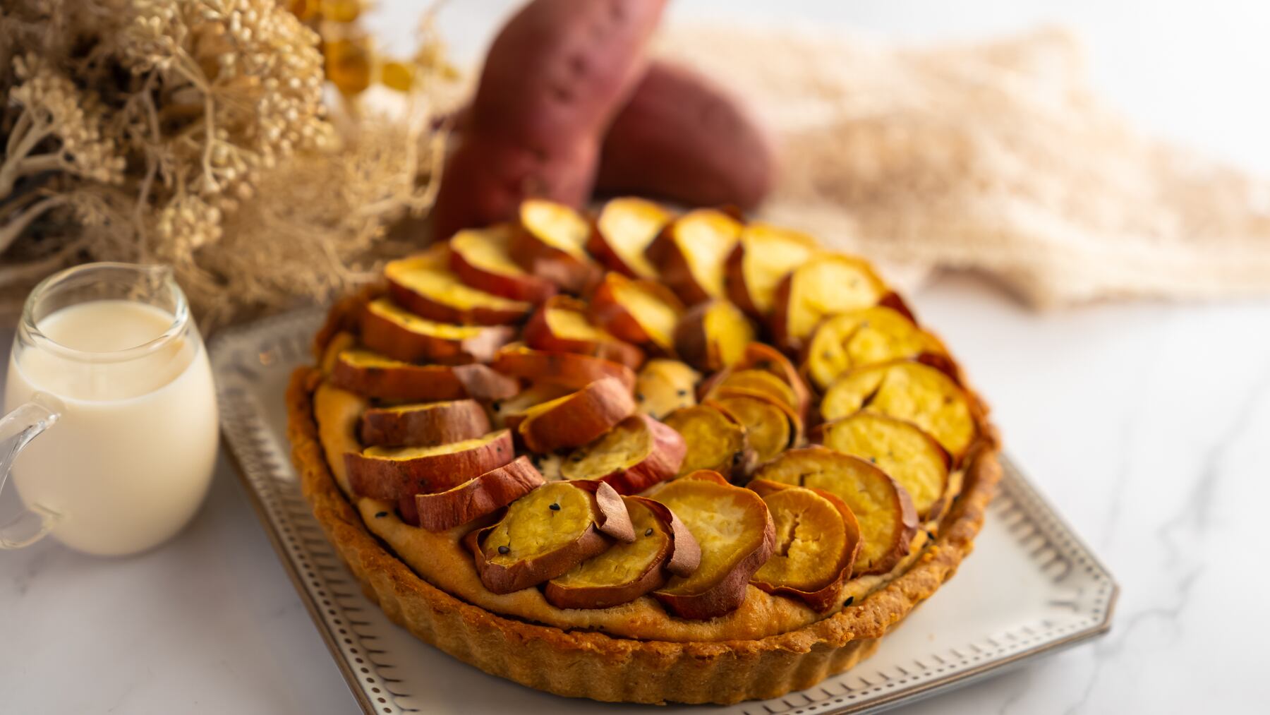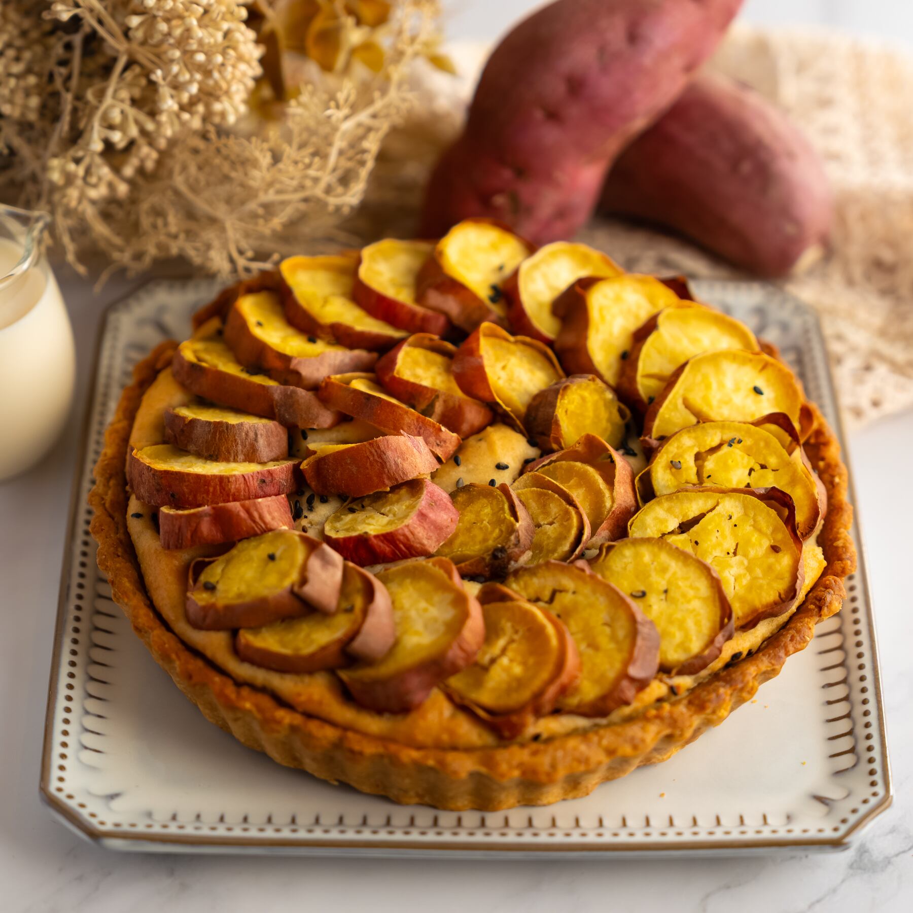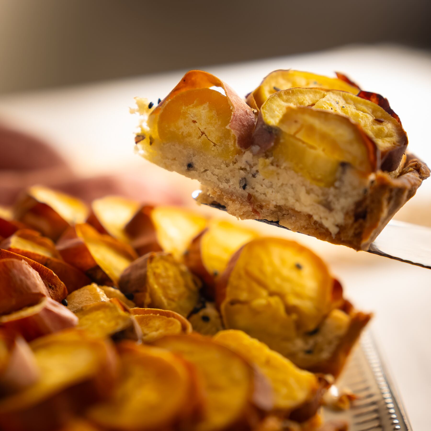 ◆全粒粉のざっくりタルトの上に香ばしい炒り立ての黒ゴマとアーモンドクリームをざっくりと混ぜ合わせタルトの上に流し込み、ホクホクの蒸したさつまいもを敷き詰めて焼き上げました。黒ゴマの香ばしさが食欲をそそります♪
