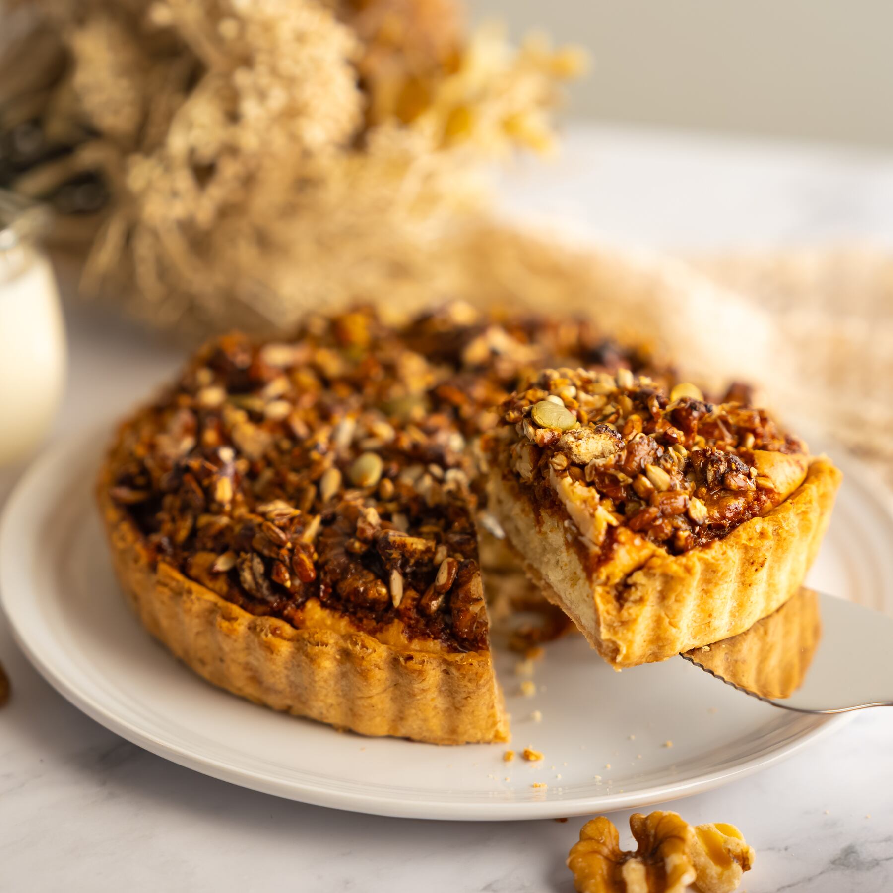 ◆甜菜糖で香ばしくキャラメリゼしたクルミをアーモンド粉と豆乳で混ぜ合わせたアーモンドクリームの上にどっさりと敷き詰めて焼き上げたリッチなタルトです。塩気の効いた全粒粉のタルト生地が土台となっていてこれまた相性抜群。贅沢なタルトは五臓六腑を満たします♪